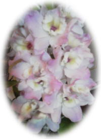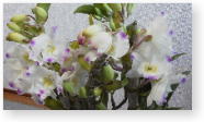 白地に芯がうすい黄色、花びらに紫がかったローズ色の斑点模様がついています。